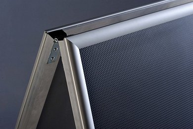 Oboustranný A-stojan se stabilními hliníkovými nohami a dvěma klap-rámy 25 mm. Stojan disponuje nárazuvzdornými podložkami a je vhodný čistě pro vnitřní používání.