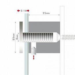 Průměr hlavy 25 mm. Vhodné pro materiály o tloušťce 2-16 mm. Odstup od zdi 25 mm.