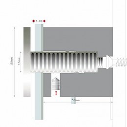 Průměr hlavy 50 mm. Vhodné pro materiály o tloušťce 5-40 mm. Odstup od zdi 50 mm.