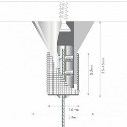 Lankový držák na strop, který je možné použít v kombinaci s ocelovým lankem. Maximální tloušťka lana 1,8 mm.