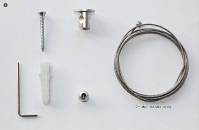Jednoduše montovatelné. Úchyt do stropu, 2m ocelového lanka s kuličkou. Materiál stříbrný matný eloxovaný hliník.
