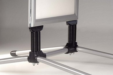 Stabilní oboustranný venkovní poutač, 100% vodotěsný. Pohyblivé upevnění rámu na ocelových pružinách. Specíálně konstruovaný T-stojan. Ideální pro venkovní použití i při větrném počasí.