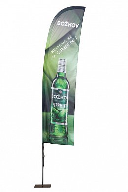 Reklamní vlajka vhodná do interiéru i exteriéru. Stožáry zhotovené z karbonových trubek zaručujících vysokou odolnost v povětrnosti, pevnost, pružnost a dlouho životnost. V příslušenství lze vybrat z různých podstavců. Kovové vložky prutů. Kompletní sestava je dodávaná v transportní tašce. Tisk na polyesterovou vlajkovinu jednostranným sublimačním tiskem - průtisk 80%.